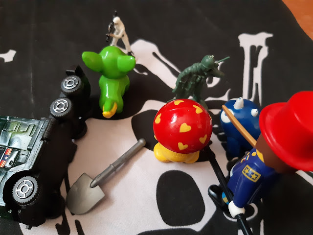 Ils traversèrent la plage et pénétrèrent dans la forêt. Ils trouvèrent un champignon jaune avec des membres et un chapeau rouge tacheté de cœurs jaunes. Son visage avait une grimace horrible et des yeux pleins de larmes.